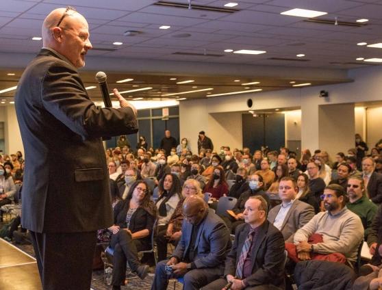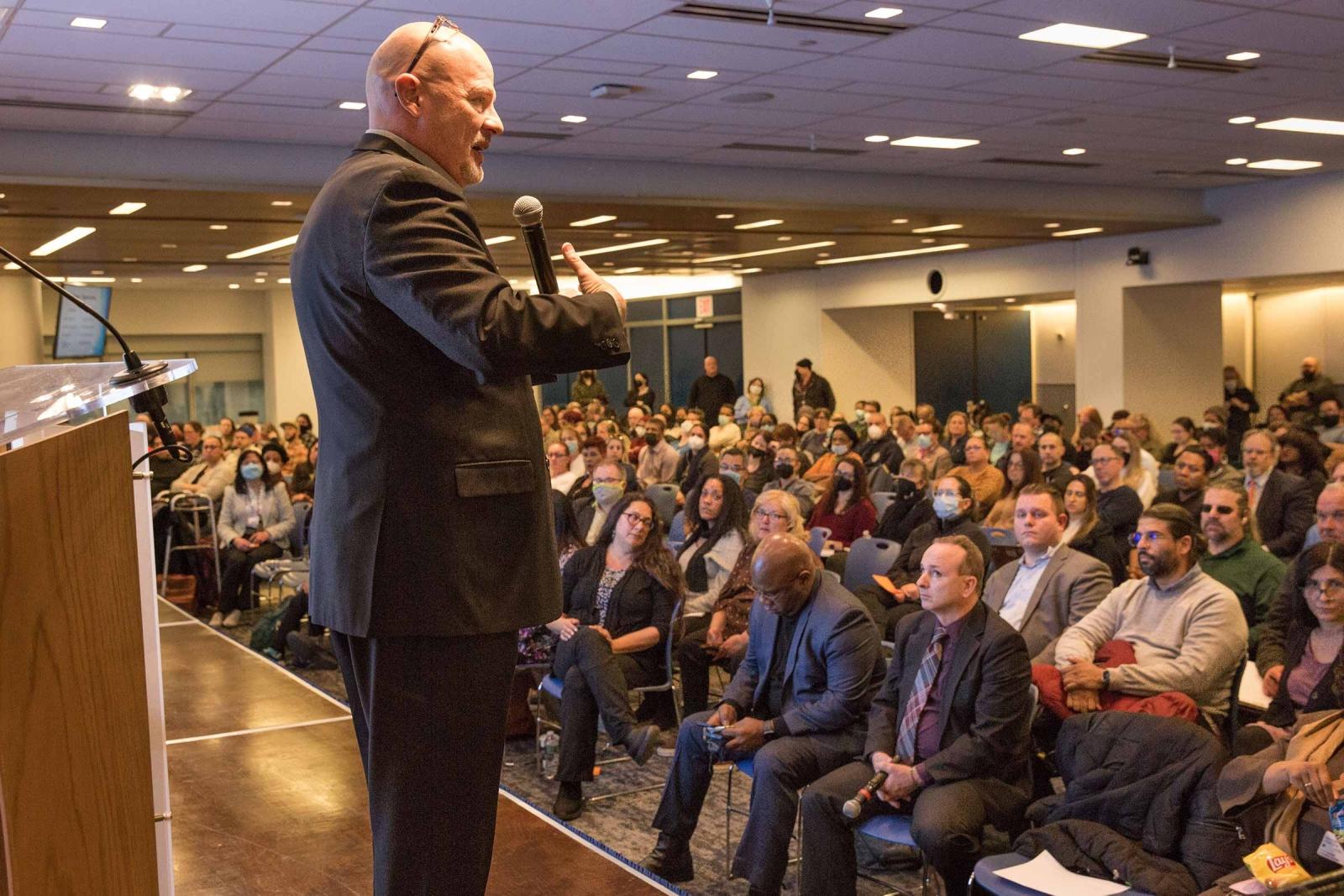 UFT President Michael Mulgrew addresses the 500-member negotiating committee.