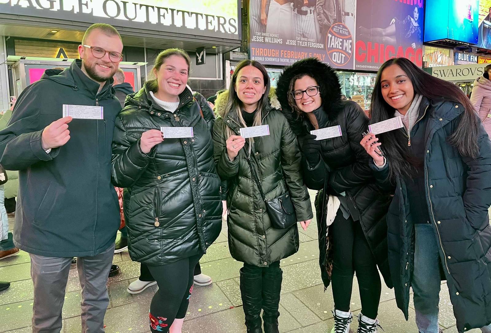 Five of the 500 UFT members attending Teachers’ Night on Broadway on Feb. 2.