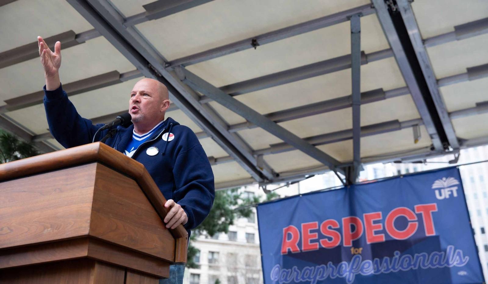 TreVaughn Taylor, a paraprofessional at P721Q John F. Kennedy Jr. School in District 75 in Queens, told the crowd that paraprofessionals are the “foundation, the support, the glue that holds our schools together,” serving as counselors, mentors, caregivers, crisis managers and much more. “And yet for too long,” he said, “we have been overlooked, underpaid and undervalued. Today, it is time to change that.”
