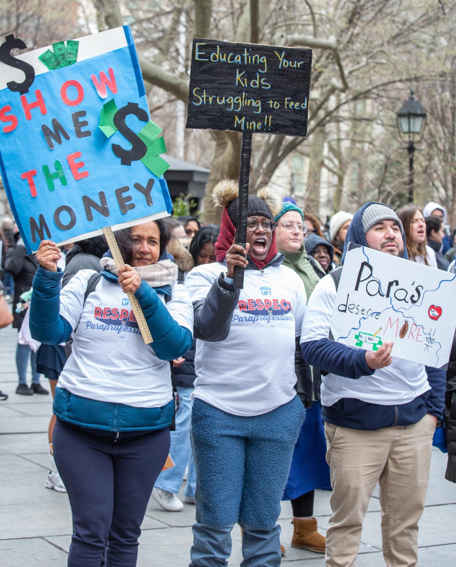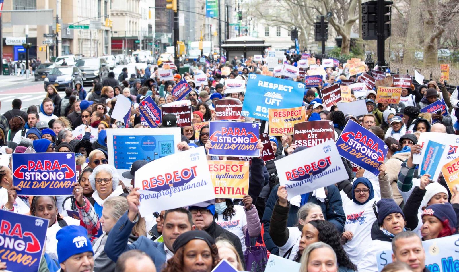 Chants of “Para power!” and “Para strong all day long!” could be heard from blocks away as more than 1,600 paraprofessionals and fellow UFT members came together from across the city on April 2 to call on the New York City Council to pass legislation to give paraprofessionals an annual “RESPECT check” of $10,000.