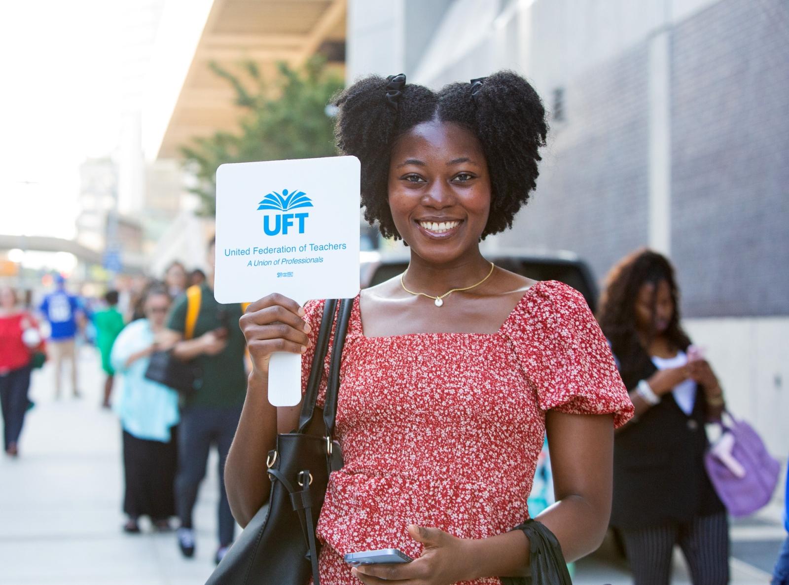 Uduak Udoh, who will teach 6th and 7th grades at Village Academy in Queens, shows her UFT pride after enrolling in the union during New Teacher Week.