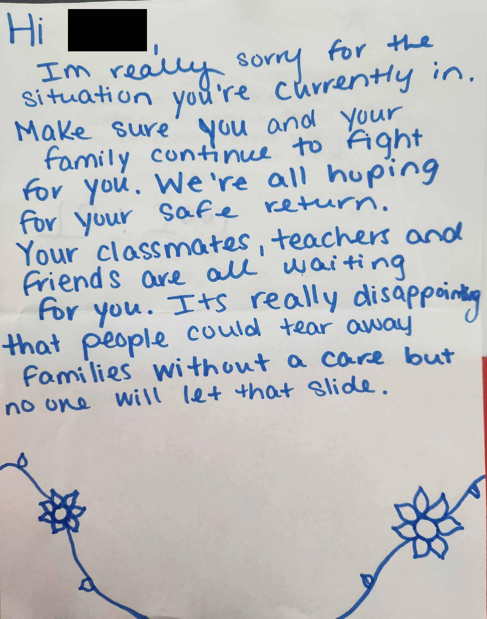 A Gotham Collaborative HS student’s note of support for a schoolmate detained by ICE.