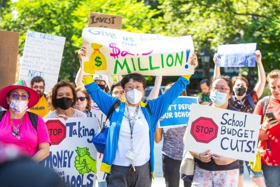Educators and parents are among the more than 300 protesters who rallied outside City Hall in Manhattan on June 24 to demand that the city Department of Education restore $215 million in school funding cuts.