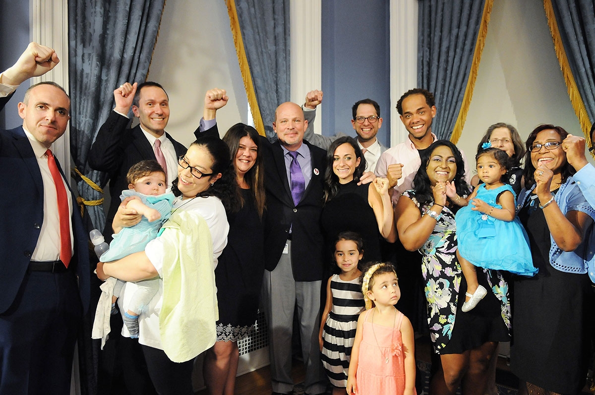 UFT President Michael Mulgrew (center) stands with members, their spouses and children who took part in the campaign to win paid parental leave for New York City public school educators at a City Hall press conference on June 20 announcing the agreement. Joining them is City Council Education Committee Chair Mark Treyger (left).
