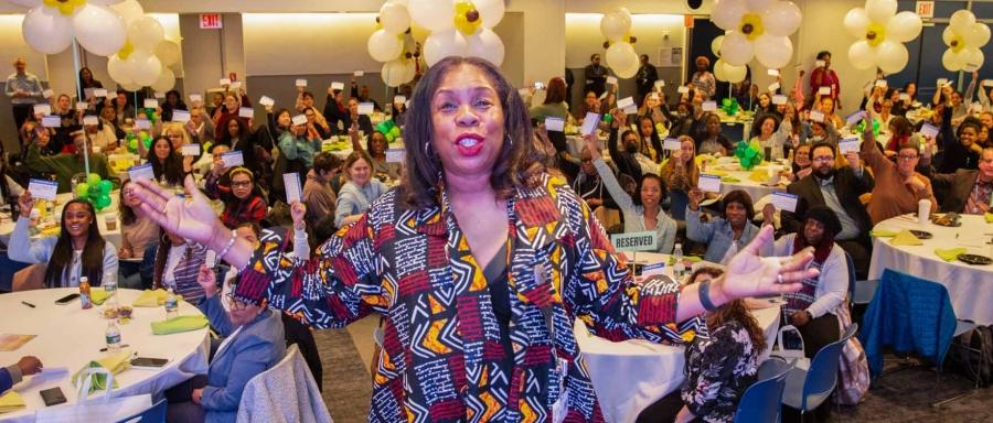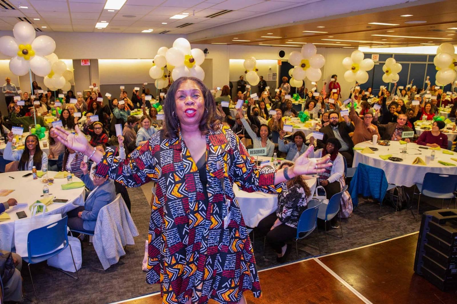 UFT Vice President for Elementary Schools Karen Alford asks members at the union's Early Childhood Conference on April 6 to hold up postcards they wrote to the mayor telling him why 3-K and pre-K matter.