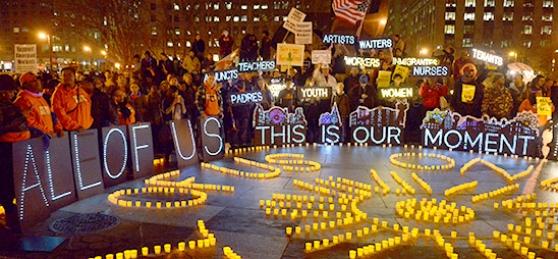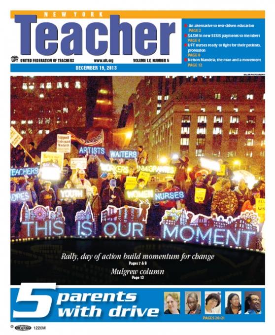 UFT members were among the thousands of workers and community activists who lit up Foley Square on Dec. 5, singing, dancing, chanting and carrying candles inscribed with their dreams for a better New York.