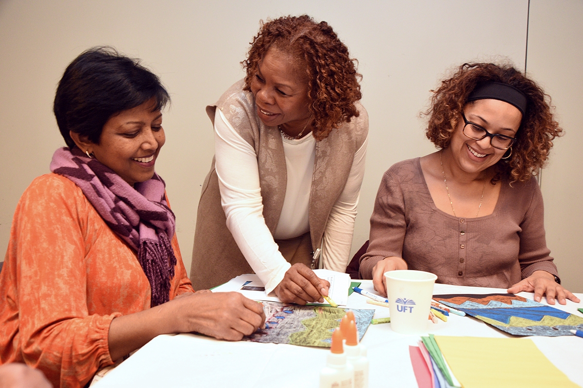 UFT Vice President for Elementary Schools Karen Alford (center) checks in on PS 146, Brooklyn, educators Mignonne Tissera (left) and Elizabeth Caraballo as they make background lines in the Cut Paper Art workshop at the UFT Early Childhood Conference on March 17.