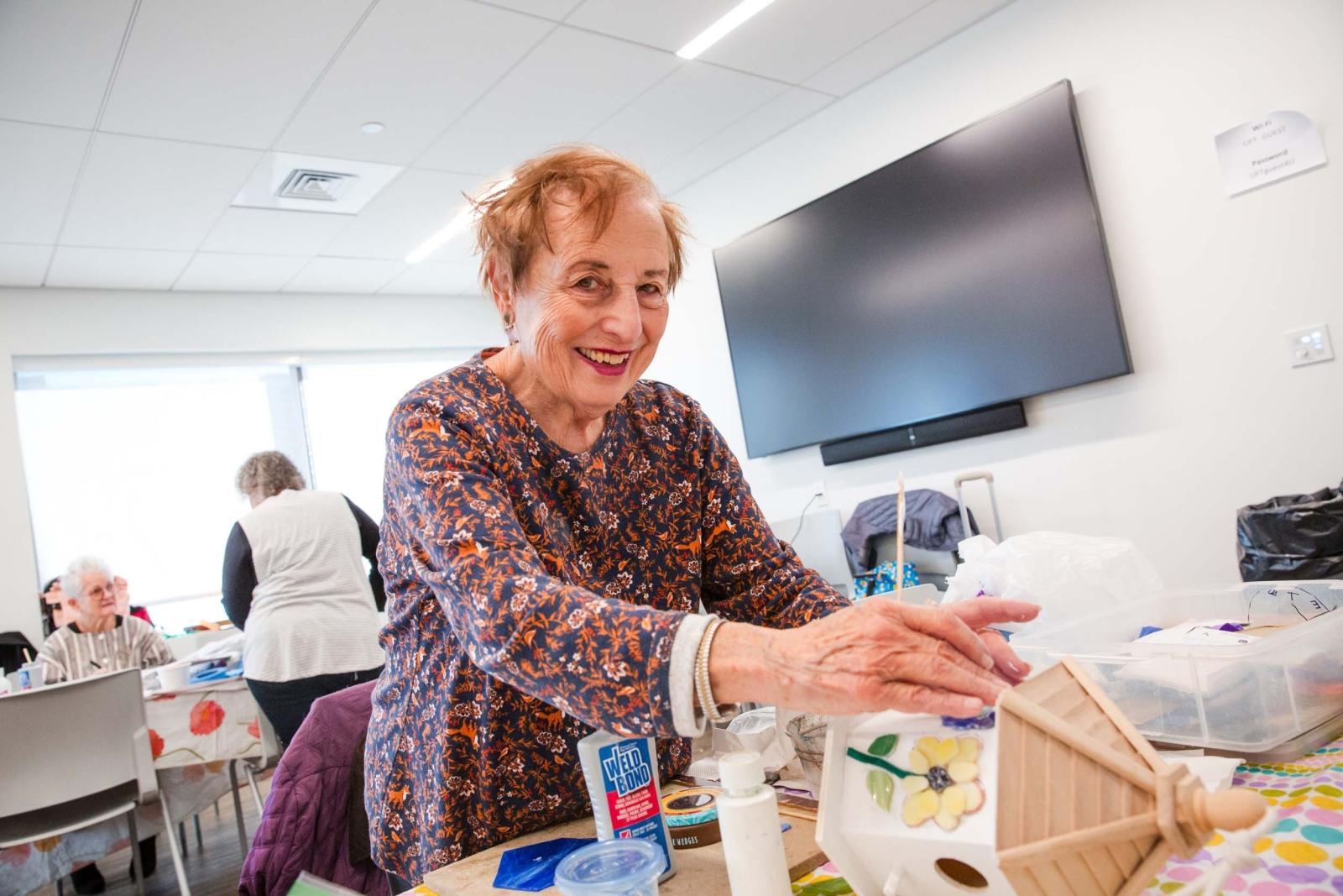 Retired school secretary Sylvia Lochansky works on a birdhouse in a glass mosiacs class at the Bronx Si Beagle Learning Center.