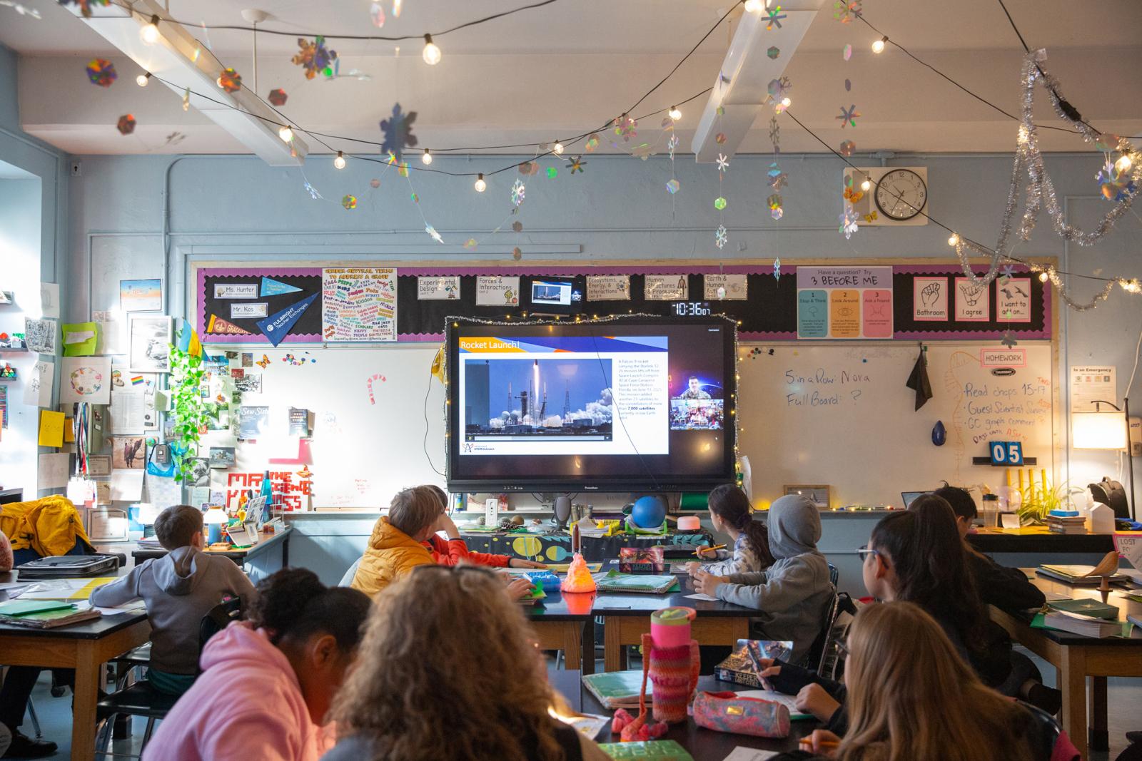 Students in Stephen Kos' science class at Manhattan's MS 245 engage in a virtual visit by technical sergeant with the U.S. Space Force.